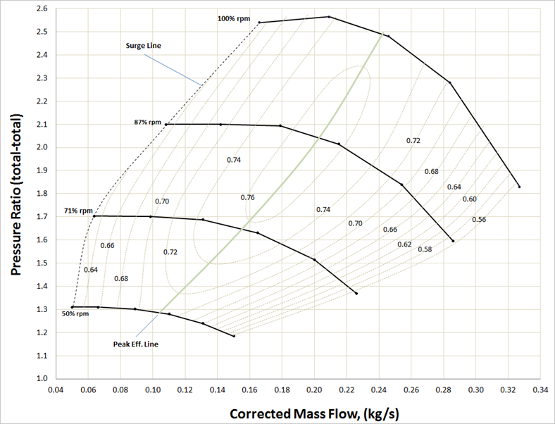 压缩机性能图显示了压缩机在其运行范围内的效率、压力比和喘振极限。效率以等高线表示,线条越靠近,效率越高。压力比通常以一系列曲线(分支)表示,每条曲线对应不同的转速(如图10所示)。