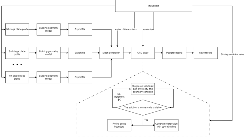 传统的压缩机图构建流程如图11所示,涵盖从CAD几何建模、网格生成、CFD仿真到结果提取与喘振边界辨识等步骤,全程需人工介入数据传递与迭代控制。