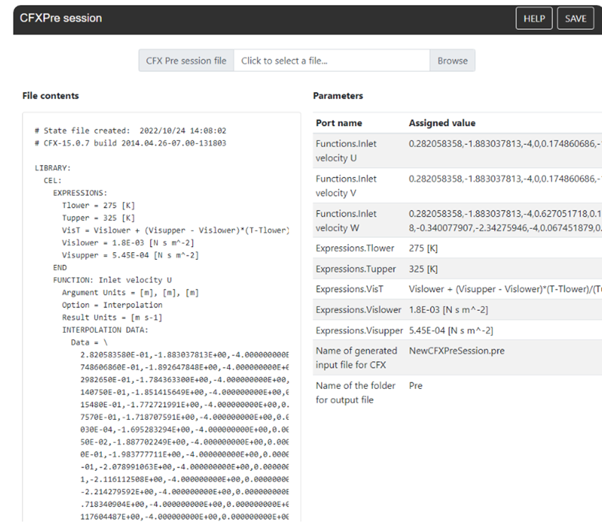 工作流程从“CFXPre session”模块开始,该模块基于包含更新边界条件值的模板文件准备新的预处理会话。在编辑模式下(图5),用户可以打开该模块并上传包含 Ansys CFX Pre 数据的文本文件模板。该模块会自动读取所有表达式和函数。在运行模式下,该模块将使用模块输入端口接收到的数据,基于模板(由用户在编辑模式下上传)生成一个包含 Ansys CFX Pre 数据的新输入文件。